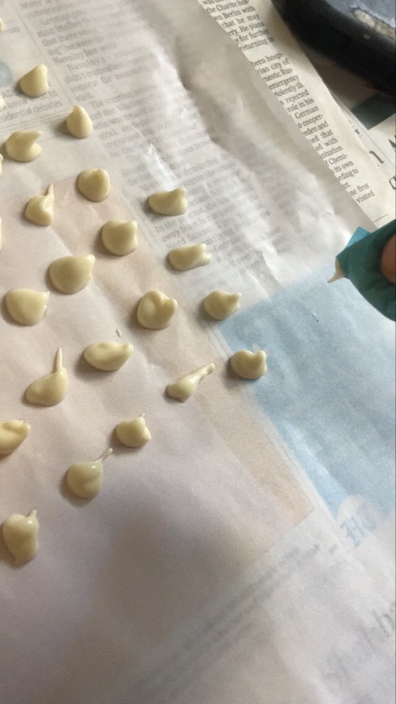 3. Add any food colour (not more than 2 drops) in the melted white chocolate. Transfer this batter into a piping/icing bag.